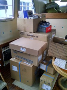 The good news is that some of the upgrading and reconfiguration is actually underway. The bad news is none of it is completed yet and I leave for home on Wednesday. I drove up to Anacortes this time to bring some tools and equipment. I left Santa Ynez on the 10th, got to Soledad and had to turn around and go all the way back to Santa Maria for car repairs. So I finally got on the road about noon, 8 hours after I started at 4 AM that morning. Got to Eureka around 8 PM, went to bed and got up on the 11th at 4AM to head to Seattle. Arrived in Seattle in torrential rainstorms at 3:30, had dinner with a friend and got up next morning at 5. Did a bit of business and hit the road for Anacortes. I spent the next two days (Dec. 13-14) contacting sub contractors and doing some maintenance and repair projects, On Friday I managed to nail down the instrumentation layout for the bridge and pilothouse and ordered all new audio electronics. The pictures below show the work in progress on the bridge and the boxes of new equipment in the salon awaiting installation. Saturday I did some of the minor Survey recommendations. On Sunday my old friend Bill Gesler came up from South Washington to see the boat and we had lunch and caught up. great little diversion. Today was more of the same, meeting with subs, working on small items. I did get the black tanks emptied! It’s getting cold and black again, more rain expected. Tomorrow is my last day here until after Christmas sometime. I will come back up for the installation of the new fly-bridge hardtop. after that it’s on to the cabinetry and completion of the main salon.