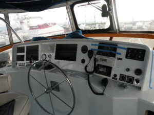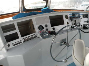 The good news is that some of the upgrading and reconfiguration is actually underway. The bad news is none of it is completed yet and I leave for home on Wednesday. I drove up to Anacortes this time to bring some tools and equipment. I left Santa Ynez on the 10th, got to Soledad and had to turn around and go all the way back to Santa Maria for car repairs. So I finally got on the road about noon, 8 hours after I started at 4 AM that morning. Got to Eureka around 8 PM, went to bed and got up on the 11th at 4AM to head to Seattle. Arrived in Seattle in torrential rainstorms at 3:30, had dinner with a friend and got up next morning at 5. Did a bit of business and hit the road for Anacortes. I spent the next two days (Dec. 13-14) contacting sub contractors and doing some maintenance and repair projects, On Friday I managed to nail down the instrumentation layout for the bridge and pilothouse and ordered all new audio electronics. The pictures below show the work in progress on the bridge and the boxes of new equipment in the salon awaiting installation. Saturday I did some of the minor Survey recommendations. On Sunday my old friend Bill Gesler came up from South Washington to see the boat and we had lunch and caught up. great little diversion. Today was more of the same, meeting with subs, working on small items. I did get the black tanks emptied! It’s getting cold and black again, more rain expected. Tomorrow is my last day here until after Christmas sometime. I will come back up for the installation of the new fly-bridge hardtop. after that it’s on to the cabinetry and completion of the main salon.