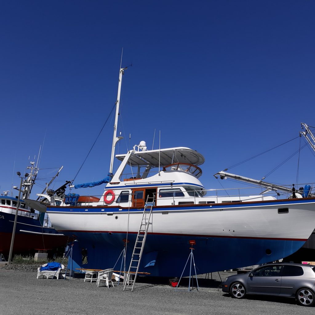 I’ll be heading back to Anacortes on the 2nd of June to try to get the rest of the projects far enough along to get Caroline back in the water. I did make some progress last trip though. The dinghy is in it’s own chocks, upright on the aft housetop, the communications antennae are in and cables pulled, supposedly the cabinetry will be done by the time I get back to the boat and I got the new lazarette hatch installed as well as the lazarette itself built. Finally, a stowage for the stern anchor rode, fenders, docklines, and miscellaneous line and deck gear. Check out the new sat-com dome above the Radar scanner and the two white antenna canisters in the above photo. These are the Wi-Fi and Cellular enhancement receiver antennae. I have developed a hernia that will need to be taken care of soon. It is interfering with my ability to be flexible enough to get into some of the tighter areas of the boat that I need to be able to work in. Also it affects my lifting capabilities. All around an unpleasant situation. Some times I think maybe something is telling me to slow down a bit. Oh well. off to the Dr.s office tomorrow.